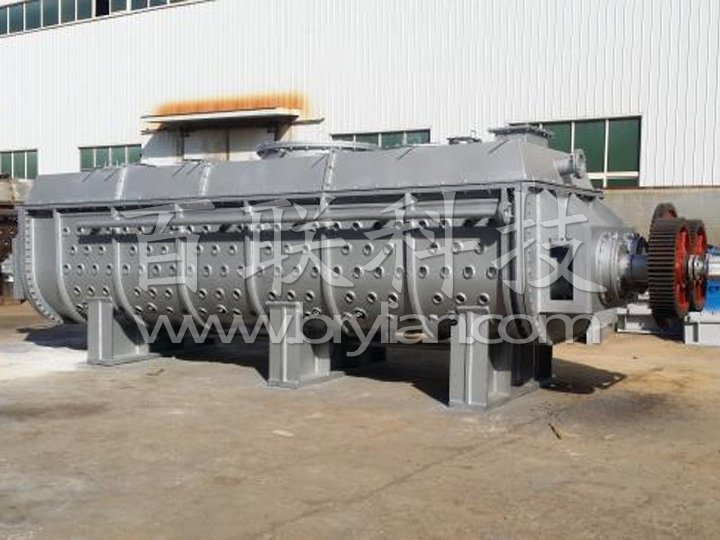 空心軸上密集排列著楔型中空漿葉,熱介質(zhì)經(jīng)空心軸流經(jīng)漿葉。單位有效容積內(nèi)傳熱面積很大,熱介質(zhì)溫度從-40℃到320℃,可以是水蒸汽,也可以是液體型:如熱水、導(dǎo)熱油等。間接傳導(dǎo)加熱,沒有攜帶空氣帶走熱量,熱量均用來加熱物料。熱量損失僅為通過器體保溫層向環(huán)境的散熱。楔型漿葉傳熱面具有自清潔功能。物料顆粒與楔型面的相對運動產(chǎn)生洗刷作用,能夠洗刷掉楔型面上附著物料,使運轉(zhuǎn)中一直保持著清潔的傳熱面。漿葉干燥機的殼體為Ω型,殼體內(nèi)一般安排二到四根空心攪拌軸。殼體有密封端蓋與上蓋,防止物料粉塵外泄而充分發(fā)揮作用。